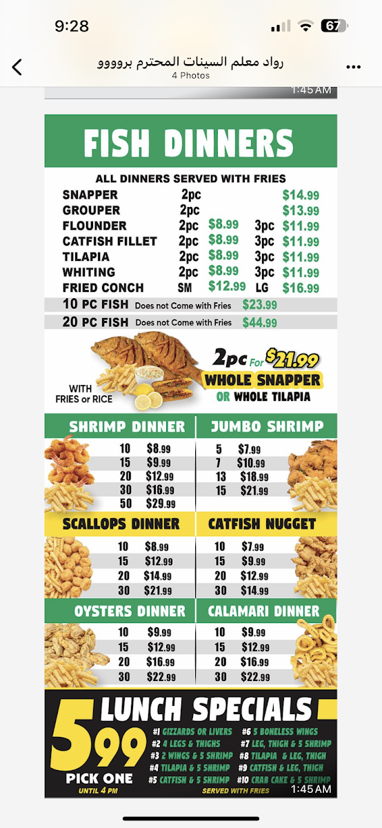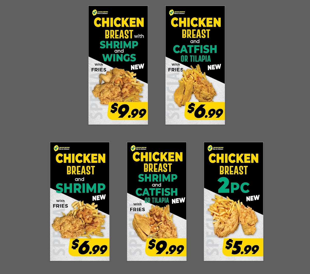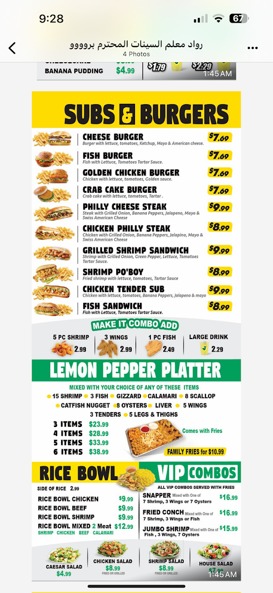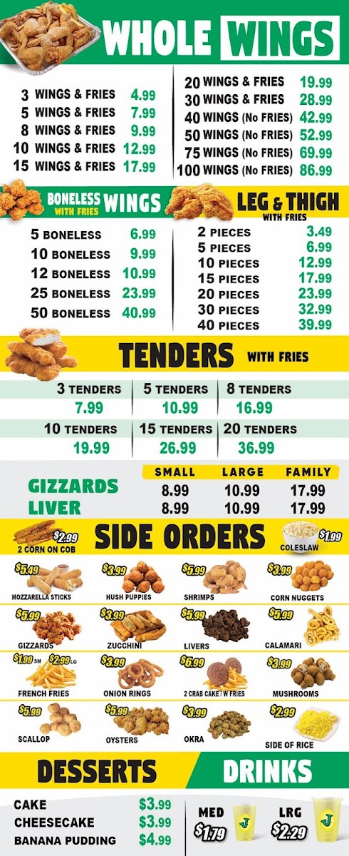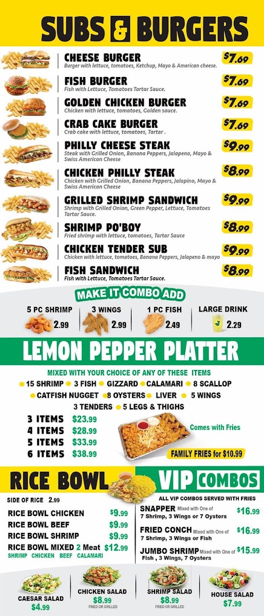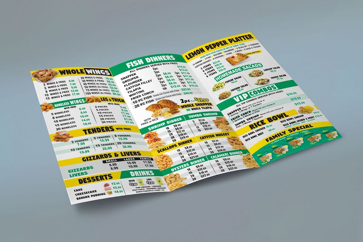 From a reviewer’s perspective, the menu at Lemon Pepper Fish And Chicken Albany delivers a well-rounded and satisfying snapshot of what the restaurant does best-comfort food with bold flavors and generous portions. The Sandwiches and Burgers with fries, including the Swiss Cheeseburger, Juicy Steak Burger, and Golden Steak Burger, provide hearty, classic options that are clearly designed to please guests looking for a filling, no-nonsense meal. Complementing these mains are the Side Orders such as Mushrooms, Fries, Gizzards, Hush Puppies, and Corn Nuggets, which add variety and familiar Southern-style sides to round out any order. For those seeking something lighter or more refreshing, the Salads-Conch Salad, Chicken House Salad, and Shrimp House Salad-offer a balanced contrast to the fried and grilled items. Seafood lovers will naturally be drawn to the Fish Dinners combo featuring Whole Tilapia, a standout option that reinforces the restaurant’s focus on fish and bold seasoning. The menu also caters well to groups and wing enthusiasts with Whole Wings with fries options like 75 Wings, 50 Wings, and 40 Wings, ideal for sharing or events. Finally, the selection is neatly finished with Desserts and Drinks, highlighted by the refreshing Pig Cup Slush 32 Ounce, which works as a sweet and cooling end to the meal. Overall, the menu feels cohesive and purposeful, combining burgers, wings, fish, sides, salads, and drinks into a complete dining experience that leaves a strong final impression.